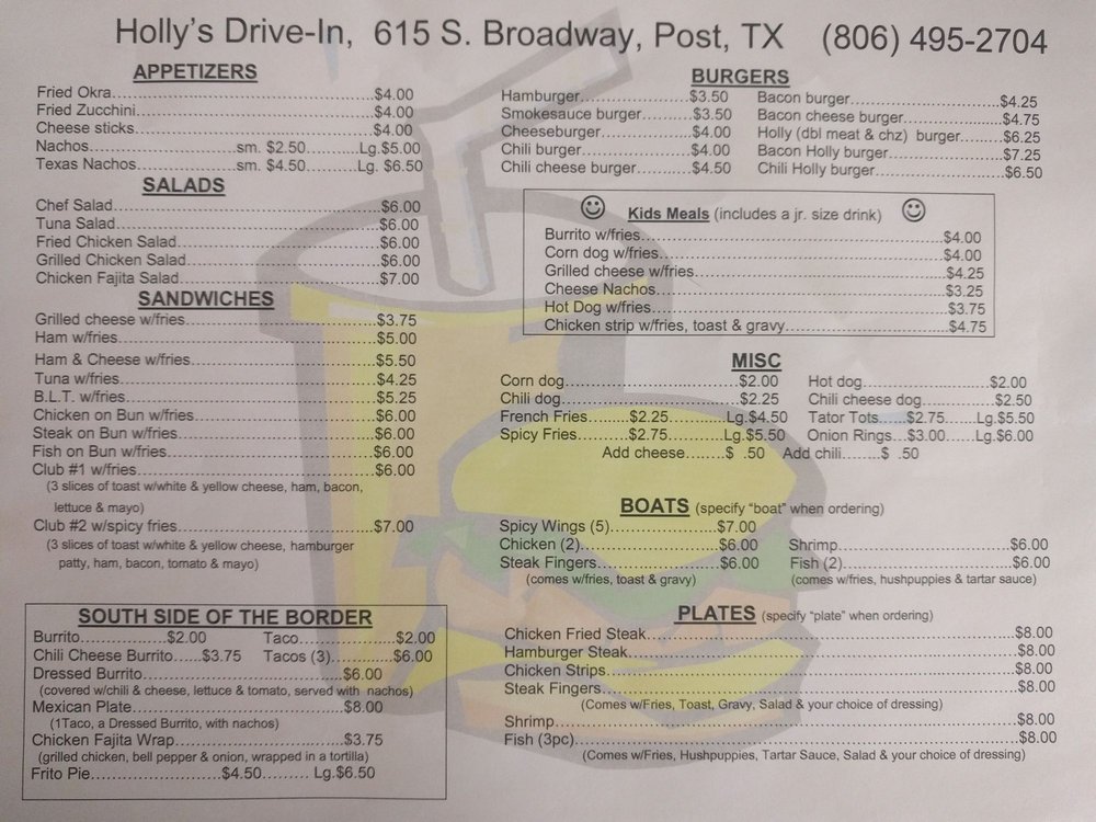 Introducing the menu at Holly's Drive Inn Restaurant is a delightful exploration of classic American comfort food, primarily celebrated for its mouthwatering burgers and sandwiches. Nestled in Post, Texas, this family-owned gem has served the community for over 50 years, creating warm nostalgia with each bite.